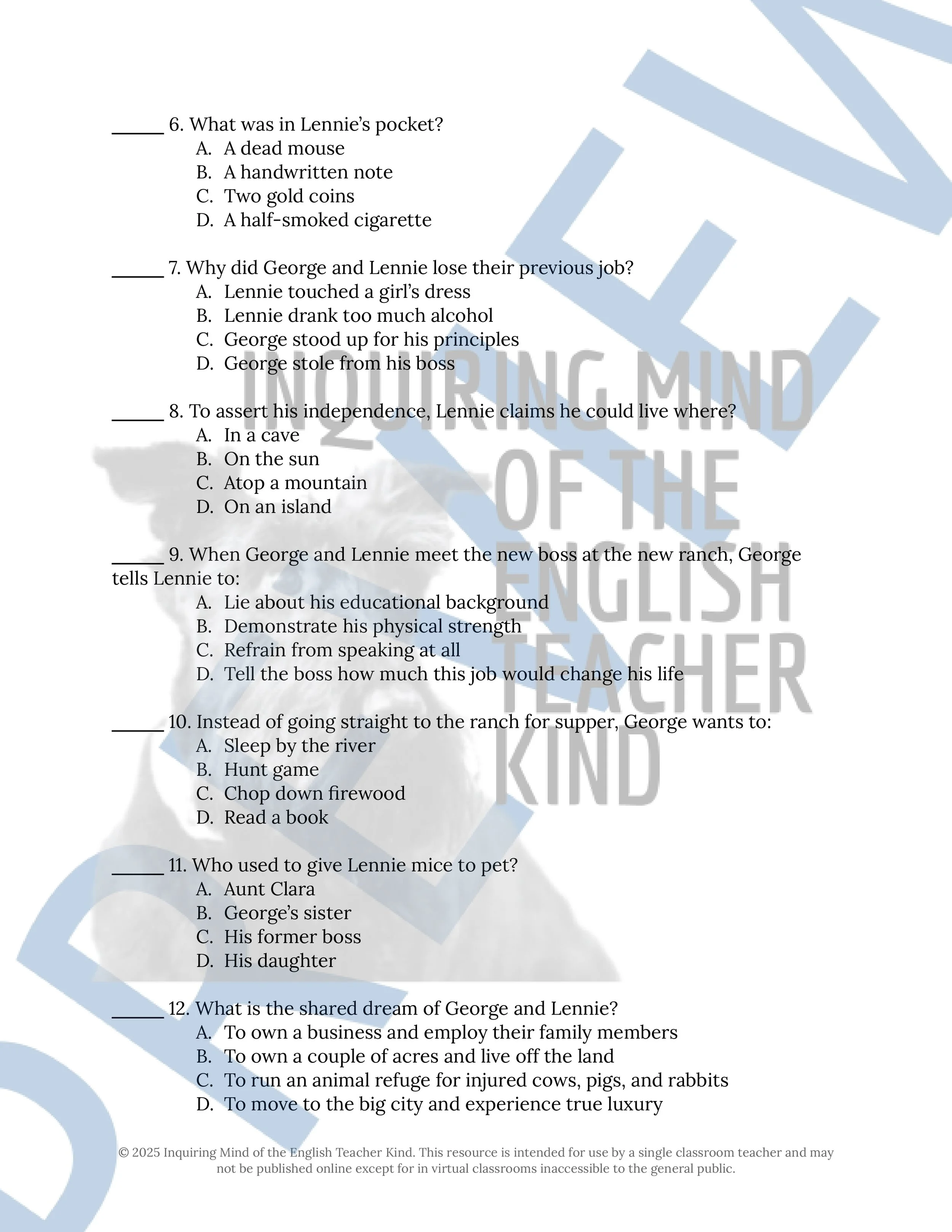 Bolster reading comprehension and help high school students navigate challenging vocabulary in John Steinbeck's Of Mice and Men with this comprehensive set of word games and activities: six vocabulary application worksheets, six crossword puzzles, and six word searches. Answer keys are included. Materials are delivered in Word Document and PDF formats. (Alternatively, a Google Drive bundle option is available.)